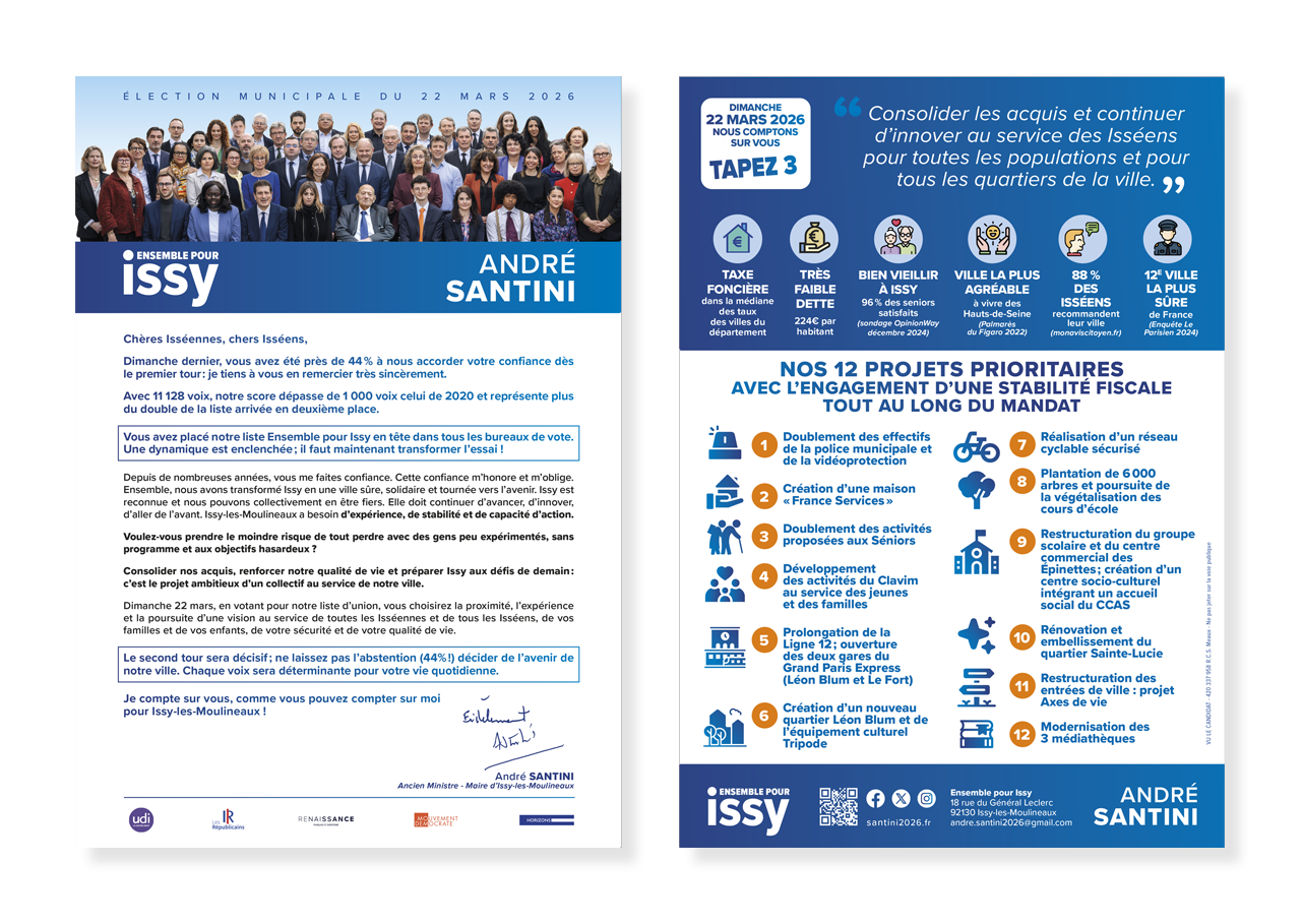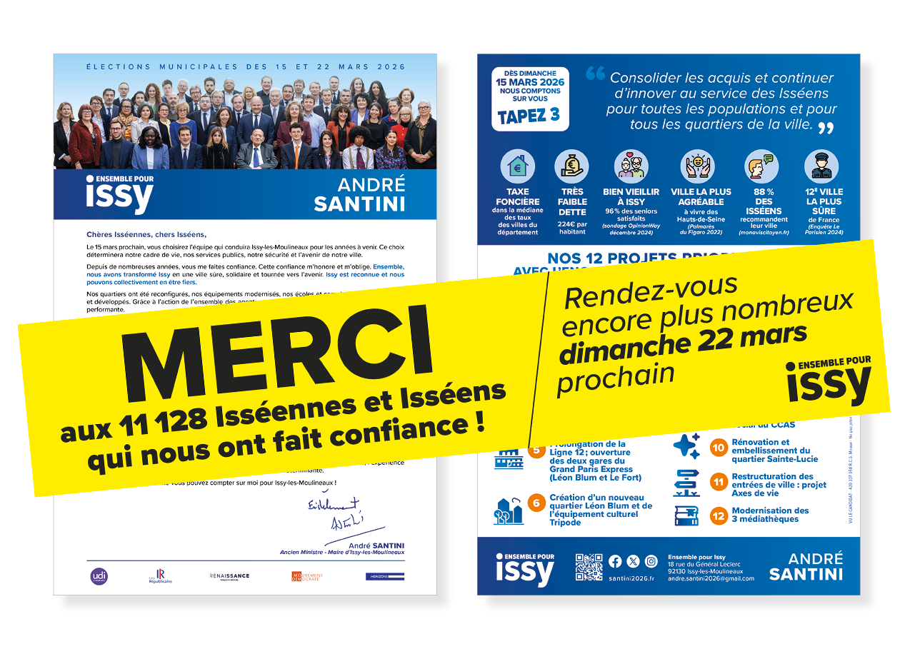 Dimanche 22 mars, en votant pour notre liste d’union, vous choisirez la proximité, l’expérience et la poursuite d’une vision au service de toutes les Isséennes et de tous les Isséens, de vos familles et de vos enfants, de votre sécurité et de votre qualité de vie.